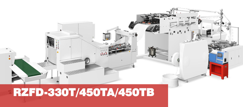 A EcoBag RZFD-330TF / 450TFA / 450TFB são projetadas para fabricar sacos e sacolas de papel de fundo quadrado com alças planas e torcidas. Totalmente automáticas, desde o carregamento do rolo de papel, fabricação e aplicação da alça plana até a formação do tubo, corte do tubo, formação do fundo e entrega final do saco. Adequadas para fabricação em massa de uma gama completa de tamanhos de sacos e sacolas de papel para indústrias como de alimentos e roupas. O processo de uma linha consiste na fabricação de alças torcidas a partir de rolos de papel e corda torcida, entrega das alças à unidade de colar, pré-corte do papel na posição da corda, colagem da posição do remendo, colagem da alça e confecção do saco de papel. O processo de fabricação do saco de papel consiste na colagem lateral, formação do tubo, corte, vinco, colagem do fundo, formação do fundo e entrega do saco. Estas máquinas possuem controlador de movimento de alta velocidade (CPU), que controla a operação do servo por meio de barramento rápido para garantir movimentos estáveis e suaves.