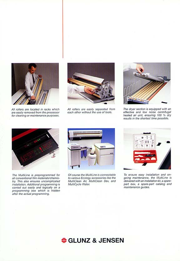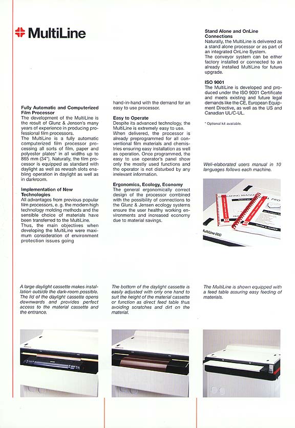 A processadora MultiLine é o resultado de muitos anos de experiência da Glunz & Jensen na produção de equipamentos para os profissonais de artes gráficas. A processadora MultiLine possui as mais avançadas características técnicas do mercado mundial: controles eletrônicos, design moderno e ergonômico, operação simplificada, transporte do material seguro, entre outros com certificação ISO 9001.