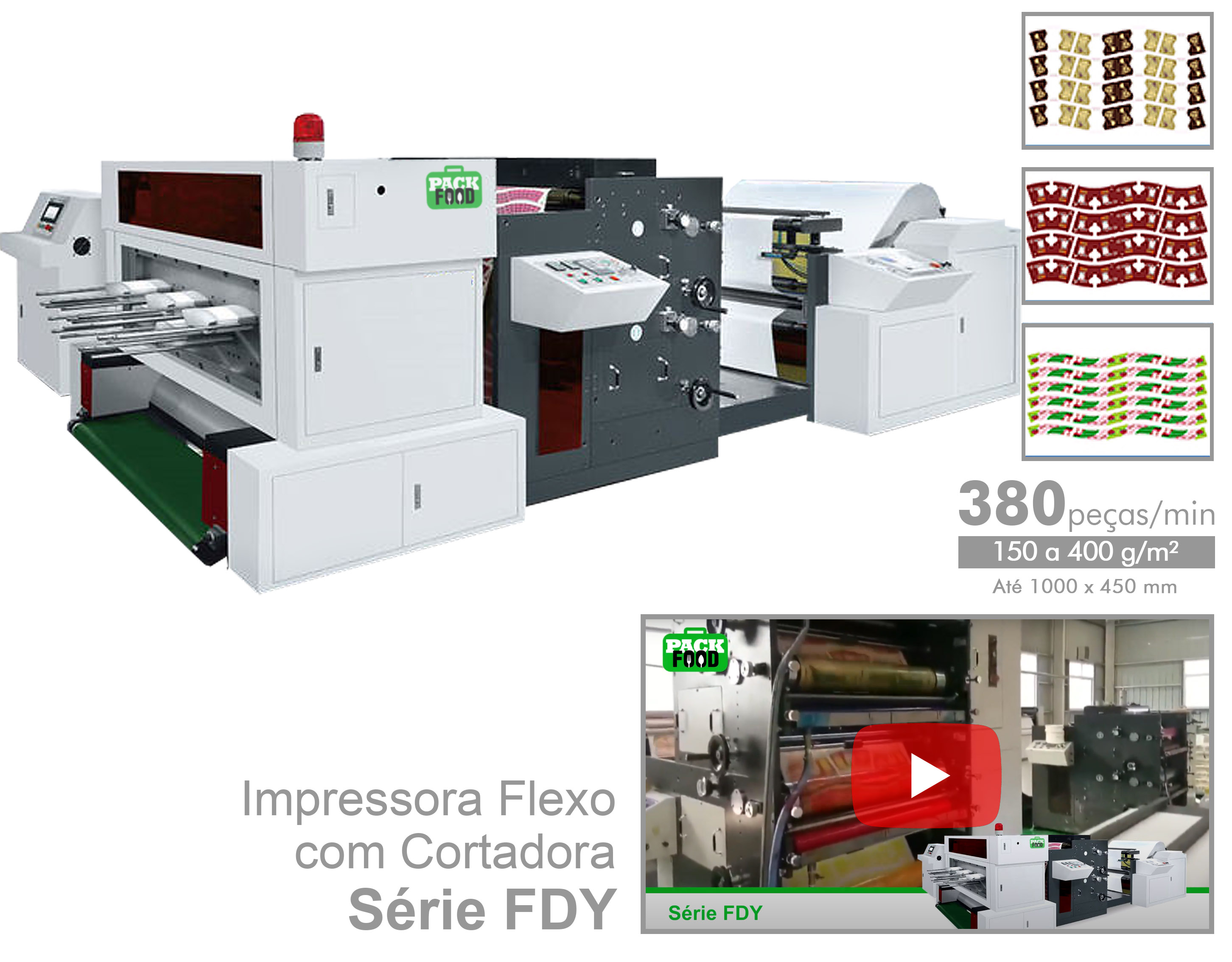As PackFoods são máquinas de alimentação em bobina ou folhas soltas para impressão, corte, vinco e montagem de caixas, bandejas, marmitex, pratos, papel em relevo, chapas de papel entre outras embalagens de vários tipos e modelos.