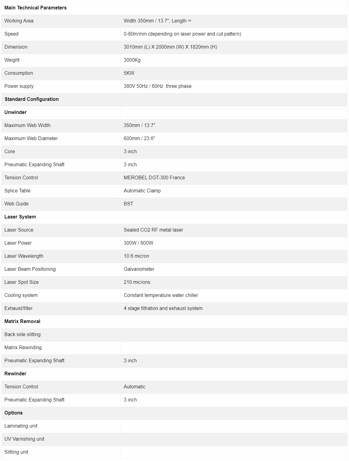 A LaserCut 350 é uma máquina de corte a laser compacta, precisa, versátil, automática e rápida no acabamento de rótulos e etiquetas. Permite o corte sob demanda de qualquer formato com velocidade máxima até 80 metros por minuto. Economize tempo e dinheiro eliminando uso de facas para cada tipo de trabalho, principalmente em pequenas tiragens, e também produza cortes homogêneos, evitando problemas em rotuladoras.